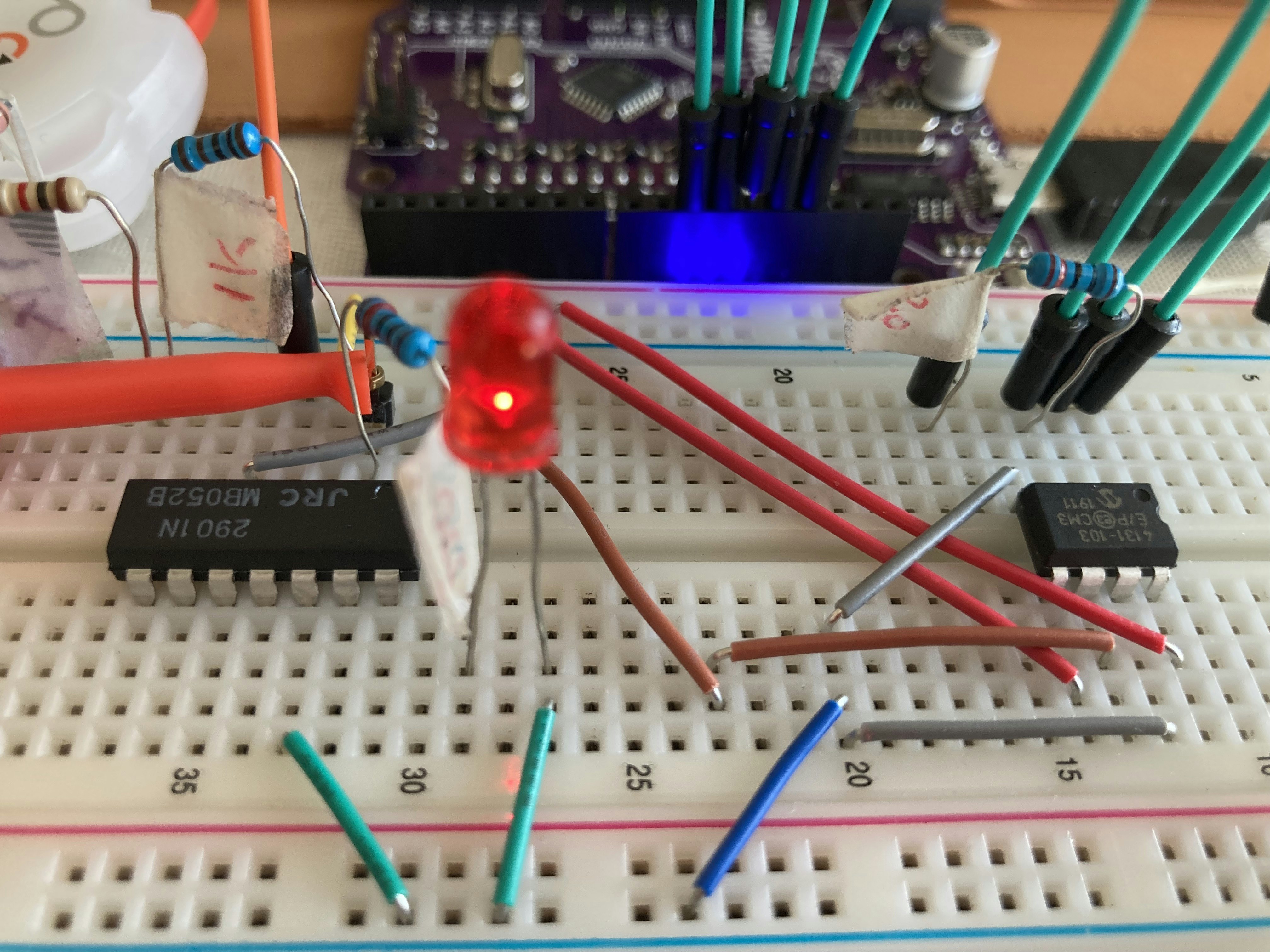 左側がコンパレータNJM2901N、右側がポテンショメーターであり、Arduino互換機から制御されている。なお、後述する「実験」では、LEDを接続せず、Pin2の電圧測定も行っている。