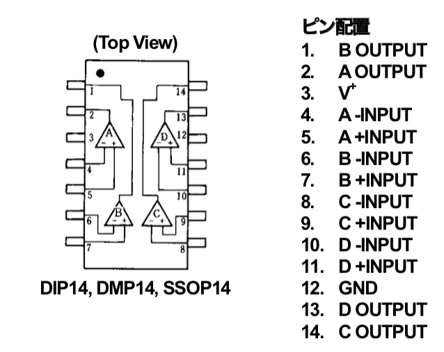 NJM2901Nのデータシートは、こちらを参照。ピン配置および基本回路を下記。